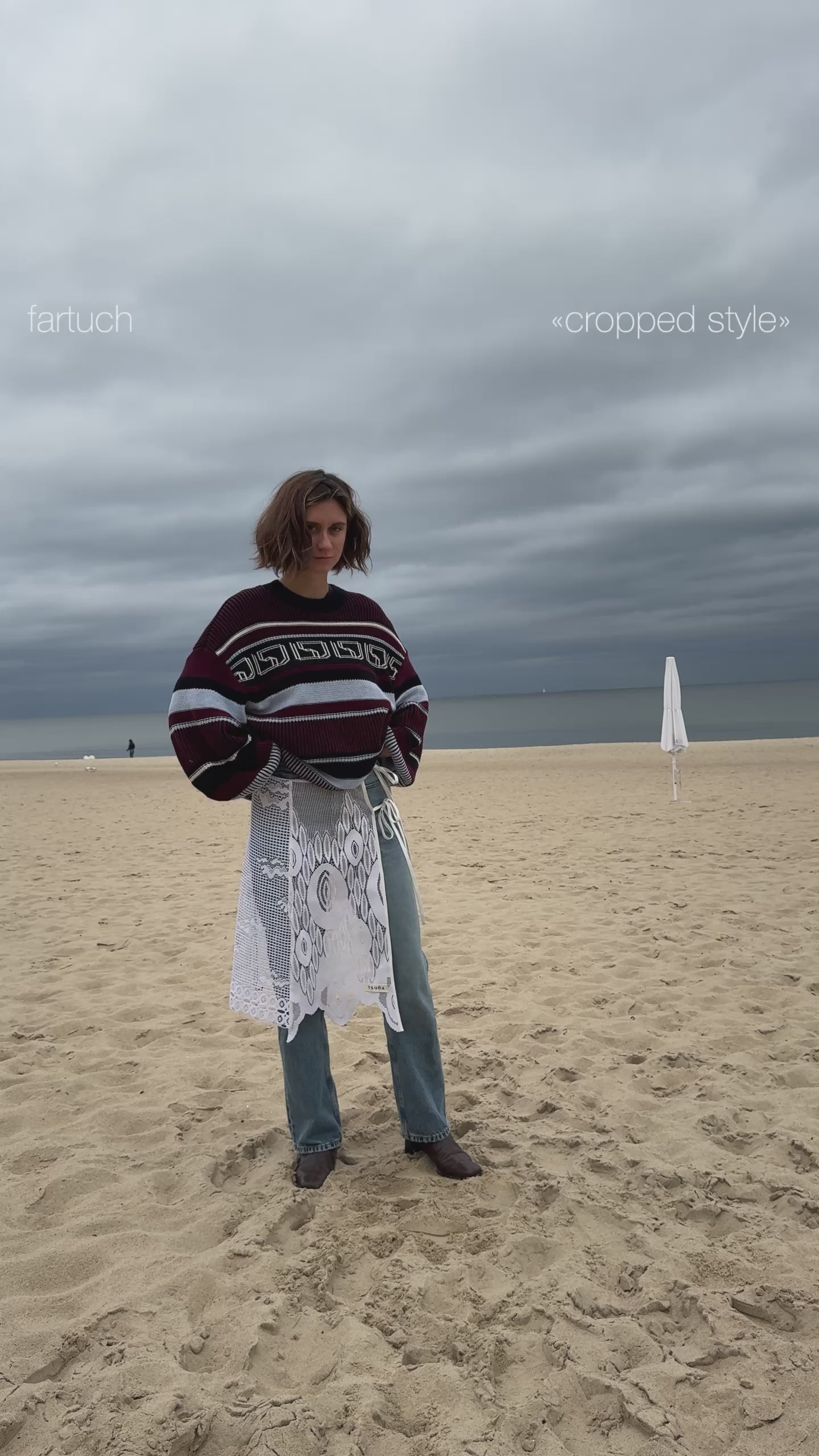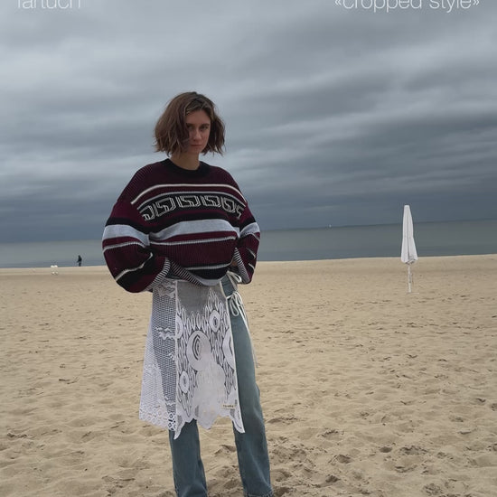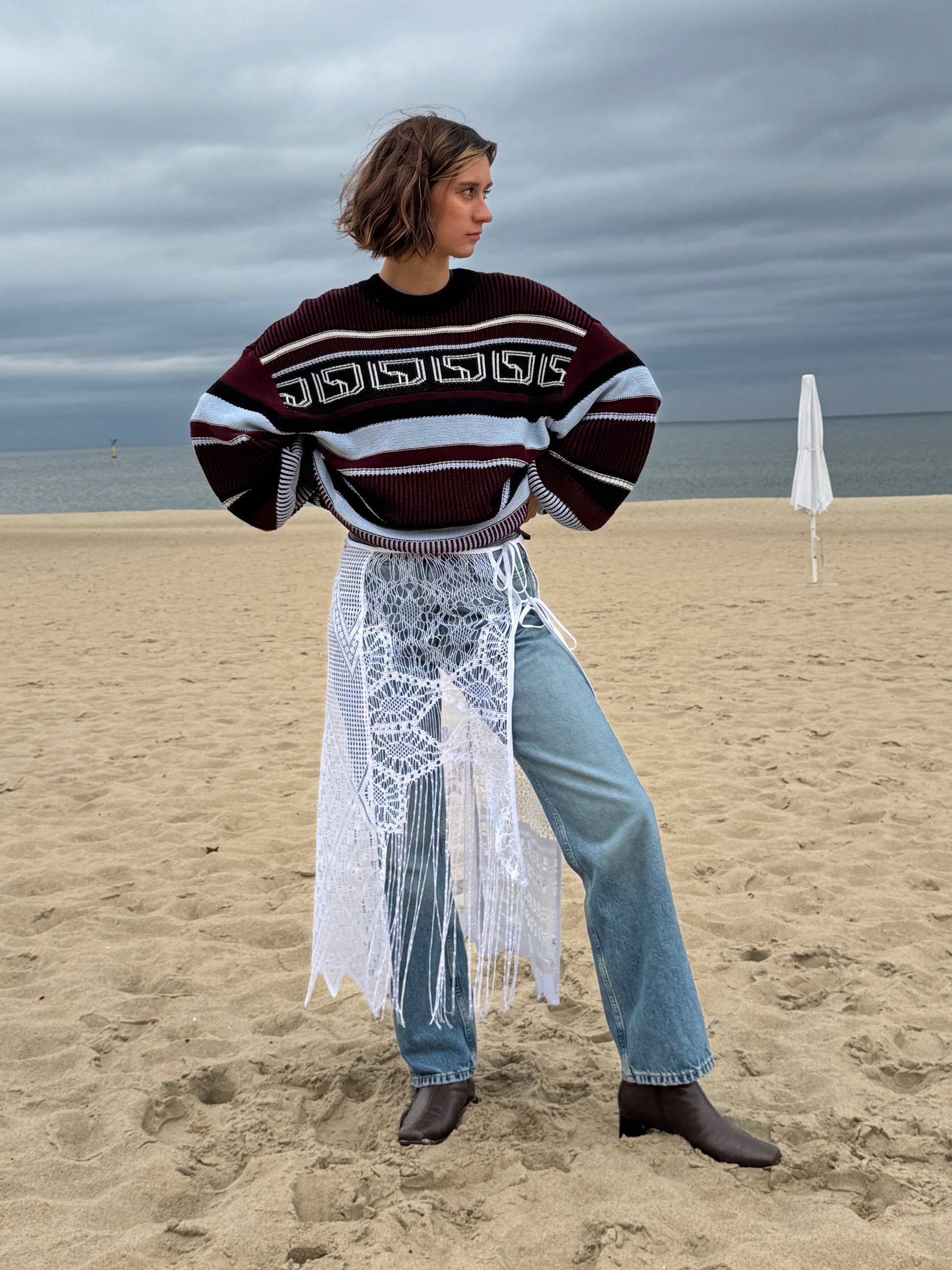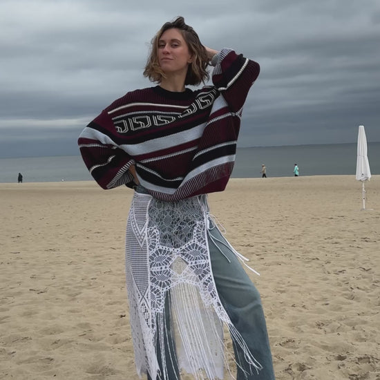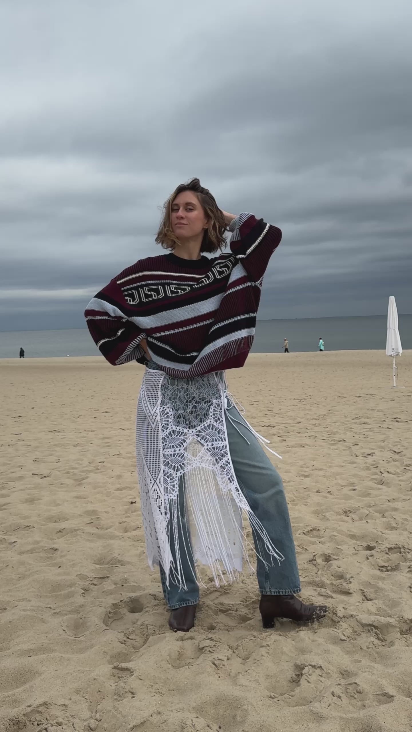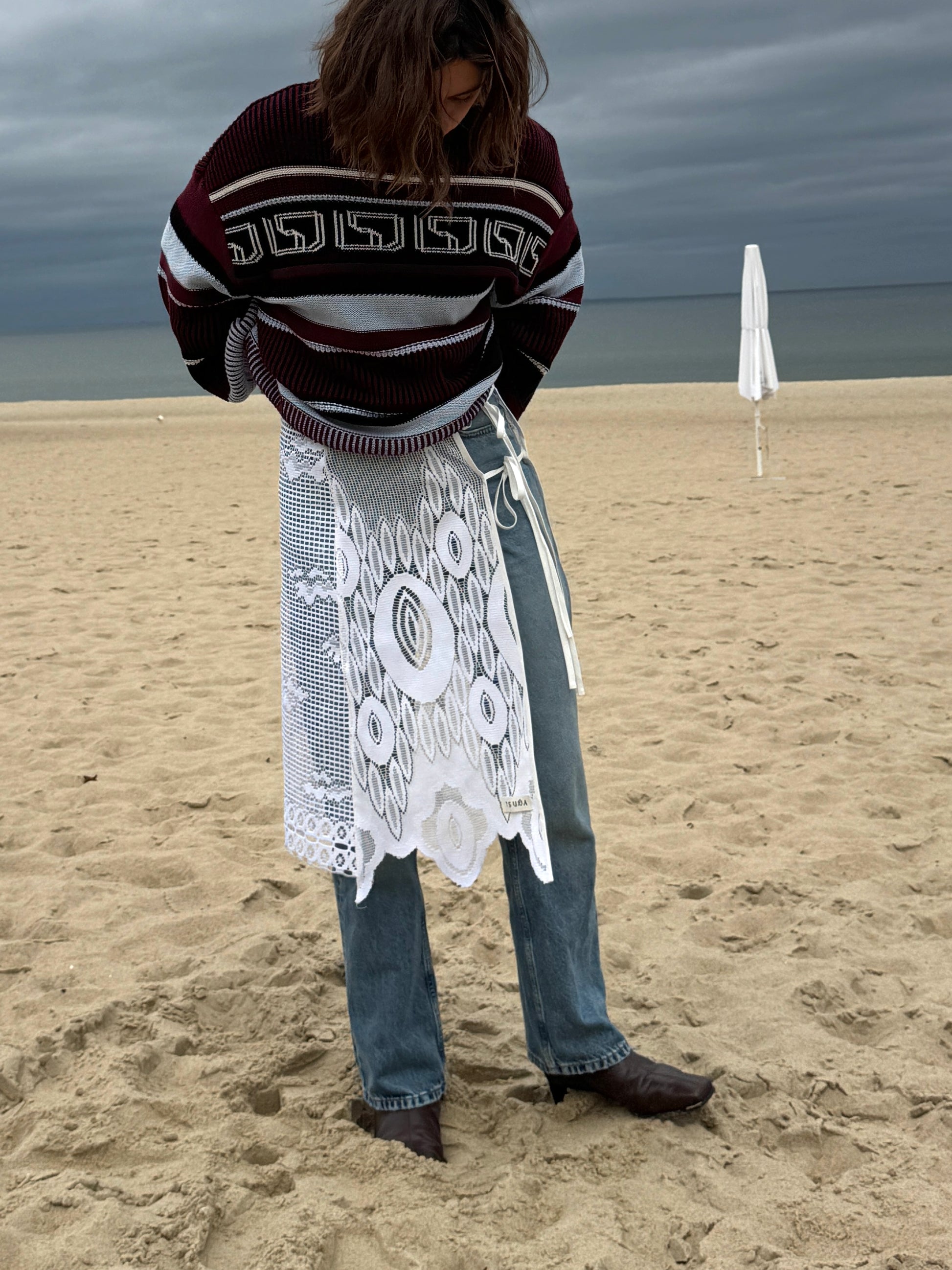Apron-style skirt made from four panels — each crafted from a different vintage curtain, with its own story and unique pattern.